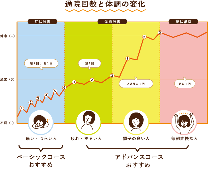 A.そうですね。人の身体は波打つように変化し、良くなっていきます。図の左の症状の方は、ベーシックコースがおすすめです。